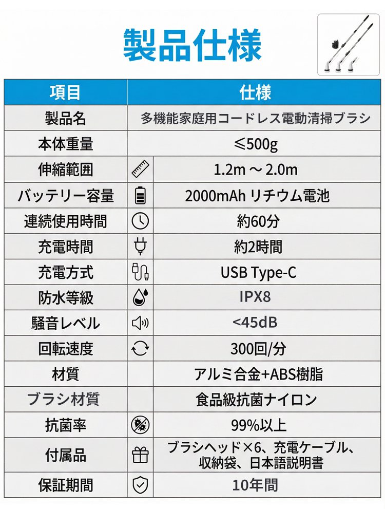 多機能コードレス電動家庭用掃除ブラシ
