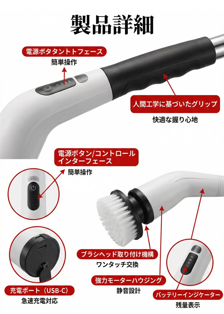 ● 強力な電動回転機能で、頑固な汚れやカビも簡単に落とせて、手間を大幅に省けます。